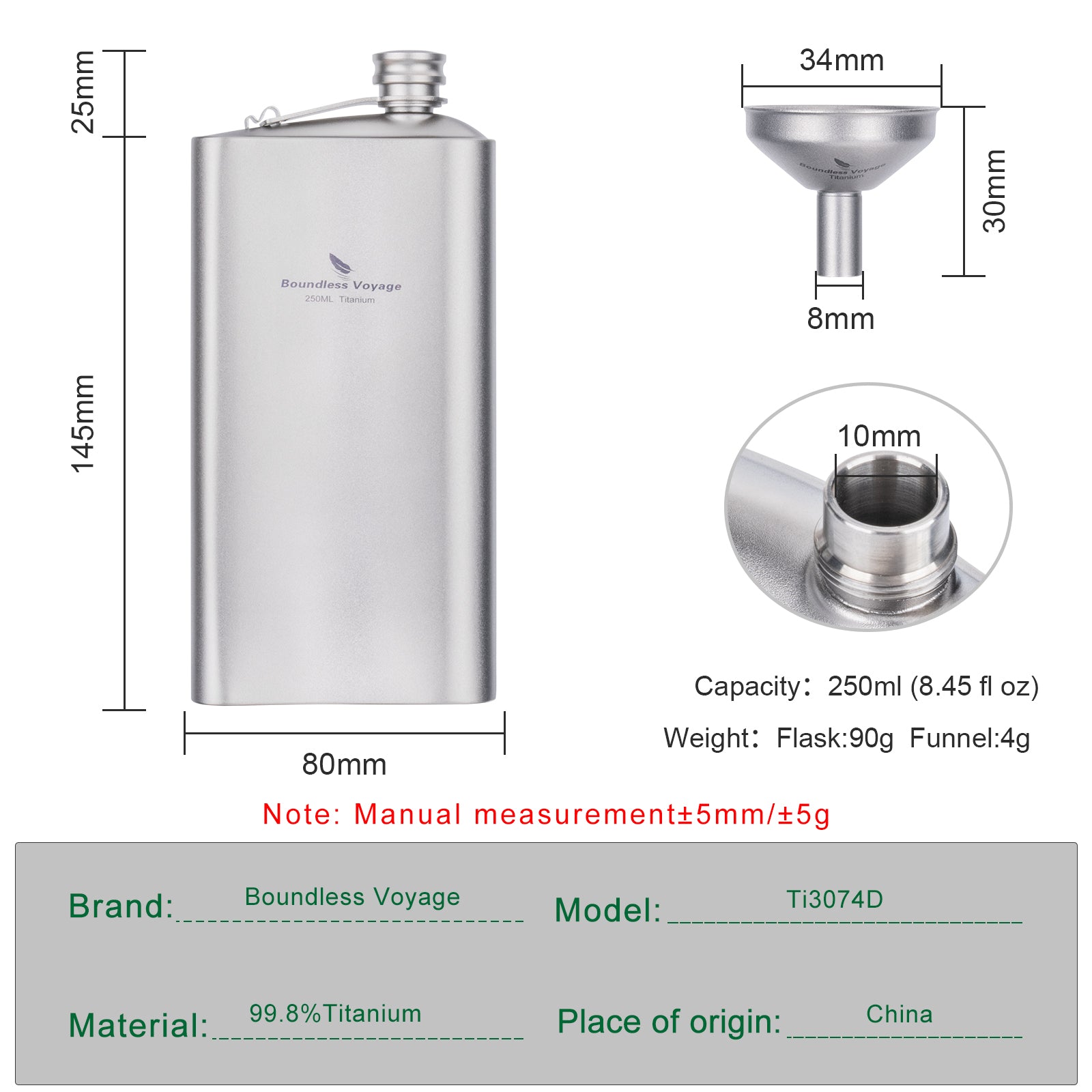 Ultralight & Durable Flask: Carry liquor with ease during your hiking and camping trips; Our flask is made with lightweight and durable TA1 titanium.