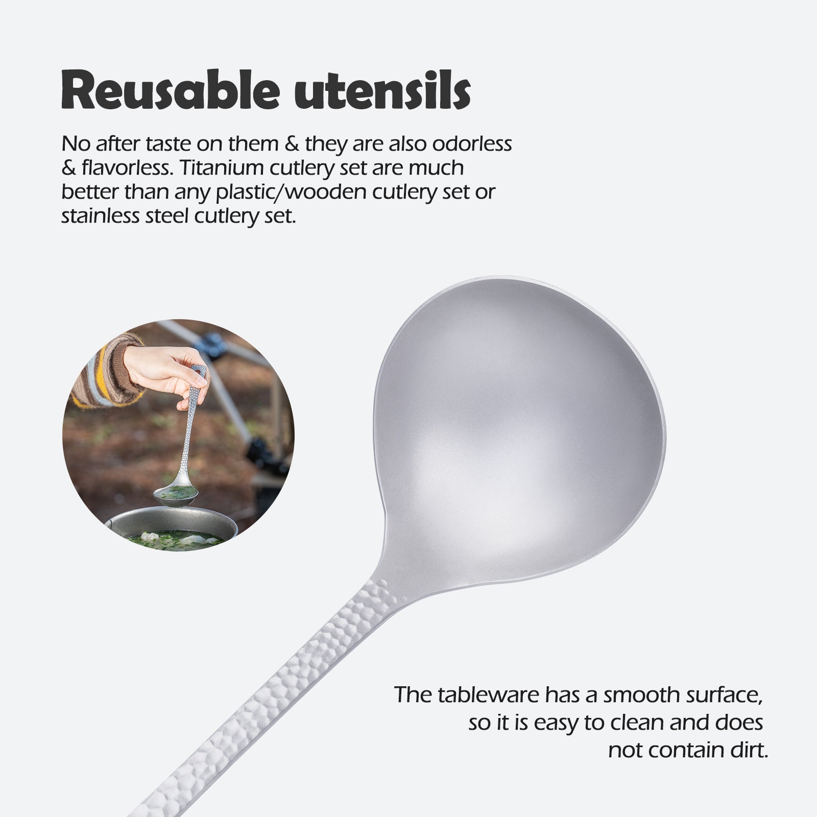 4. Reusable utensils, no after taste on them & they are also odorless & flavorless. Titanium cutlery set are much better than any plastic/wooden cutlery set or stainless steel cutlery set