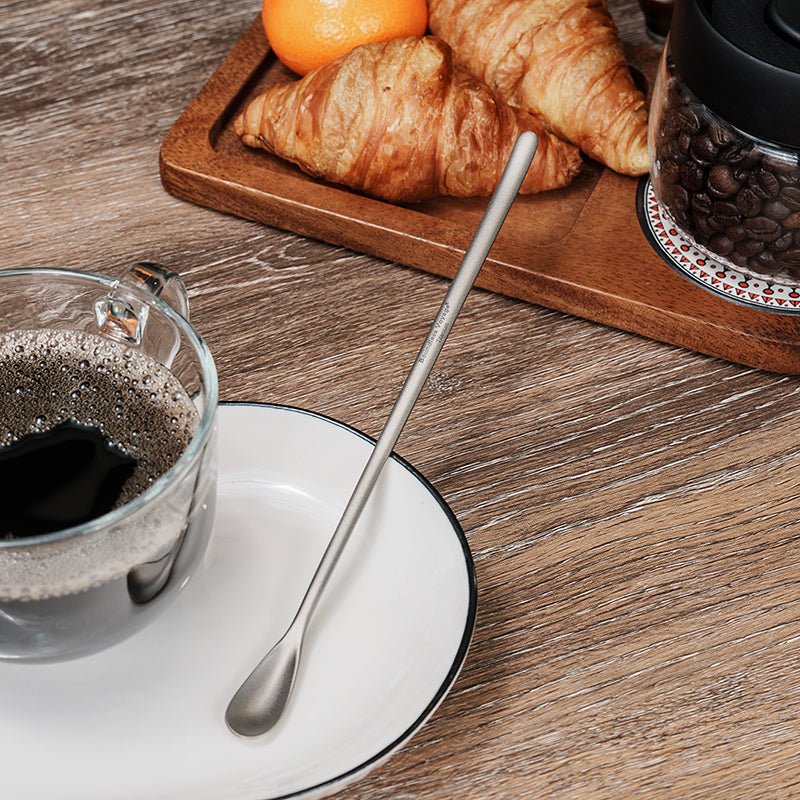 This coffee stirring spoon is made of high-quality TA1 grade titanium, ultra-light, durable and strong; Titanium does not react with the beverage, does not precipitate heavy metals, and maintains the taste of the beverage.