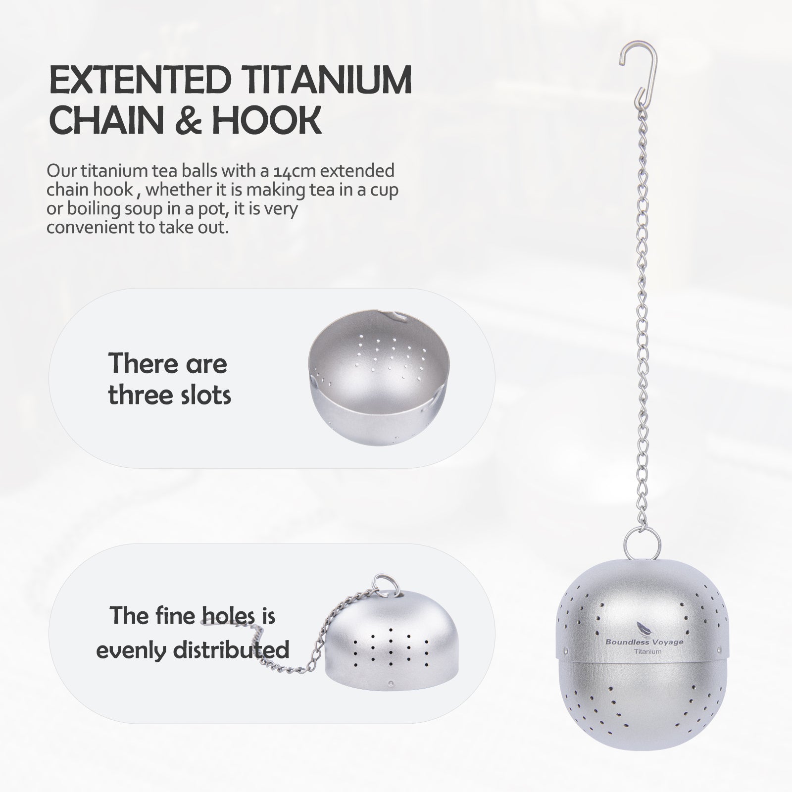 3.EXTENTED TITANIUM CHAIN & HOOK. Our titanium tea balls with a 14cm extended chain hook , whether it is making tea in a cup or boiling soup in a pot, it is very convenient to take out. The pure titanium hook at the top can catch securely on any rim of container. when brewing tea. No more worry of the floating.